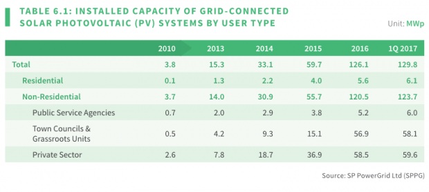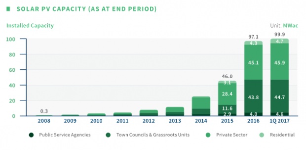 La EMA indicó que el importante crecimiento del sistema fotovoltaico se debió principalmente a las 995 nuevas instalaciones en el primer trimestre de 2016 y en el primer trimestre de este año. Al cierre del primer trimestre de 2017, Singapur contaba con un total de 1898 instalaciones solares fotovoltaicas.